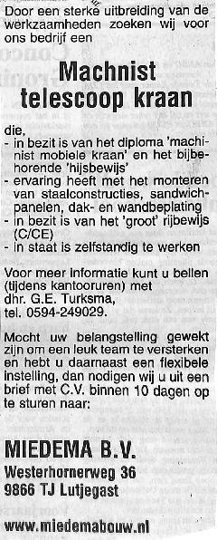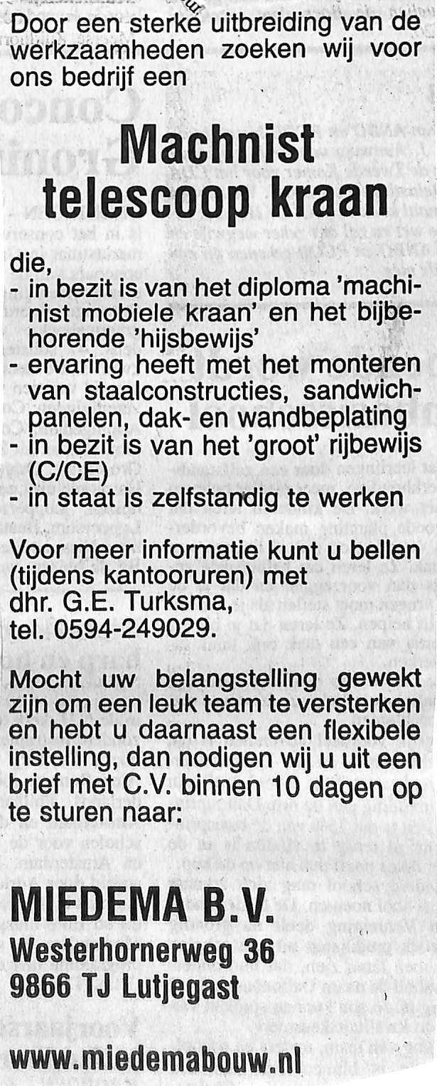 vacature voor Machinist telescoop kraan. Miedema b.v.