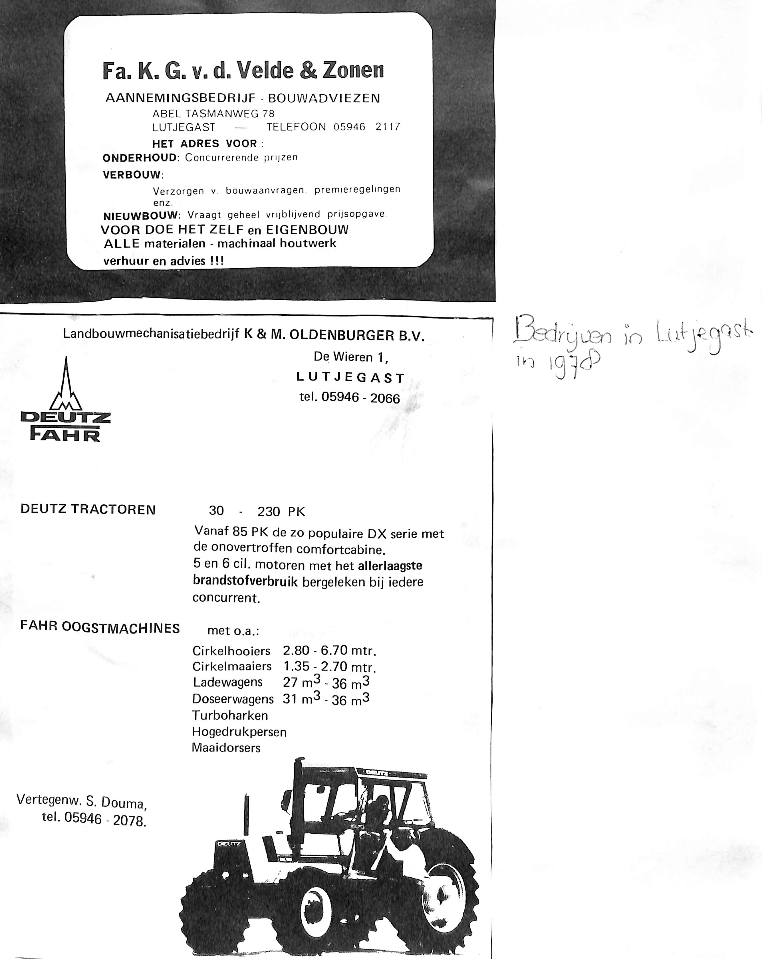 reclame voor landbouwwerktuigen; S. Douma. K. en M. Oldenburger