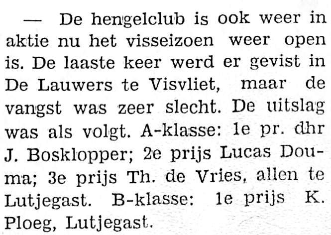 A-klasse: 1. dhr J. Bosklopper, 2. Lucas Douma, 3. Th. de Vries