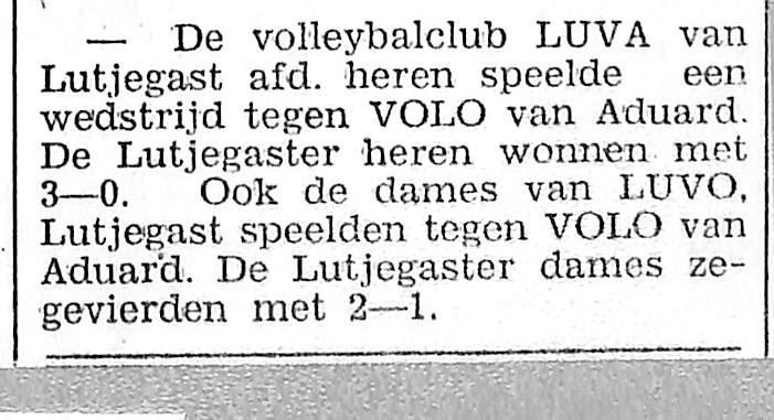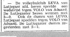 Volleybalwedstrijden: heren LUVA (moet zijn: LUVO) winnen met 3:0 van VOLO Aduard, de dames winnen met 2-1