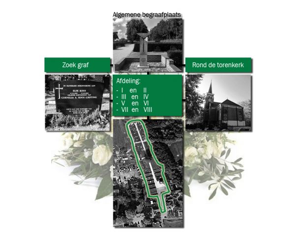 Op deze pagina kunt u een van de plattegronden uit het menu links kiezen van de verschillende onderdelen van de begraafplaatsen. Ook kunt u via de menukeuze Zoek Graf op verschillende manieren zoeken.