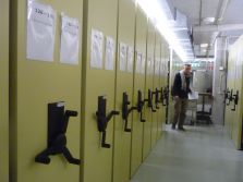 Daarna gingen we de archieven in, die zich op de eerste verdieping bevinden vanwege eventueel overstromingsgevaar. Mij vielen ook de dikke muren en deuren op. Logisch natuurlijk, want het gebouw moet bestand zijn tegen aardbevingen en brand, om nog maar te zwijgen van inbraak.