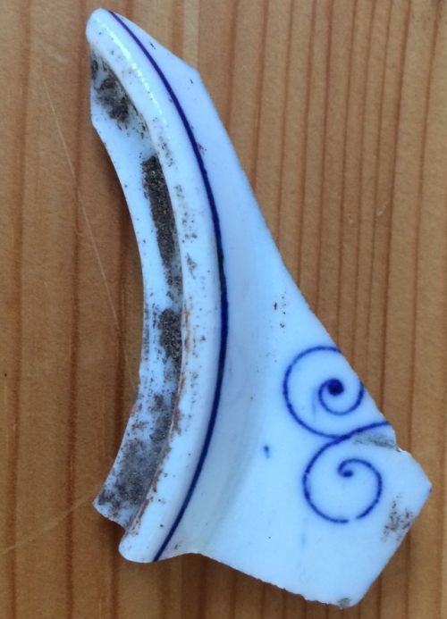 De scherf is daar in de grond gevonden. Een stukje van misschien het suikerpotje van Weit van de Naald.